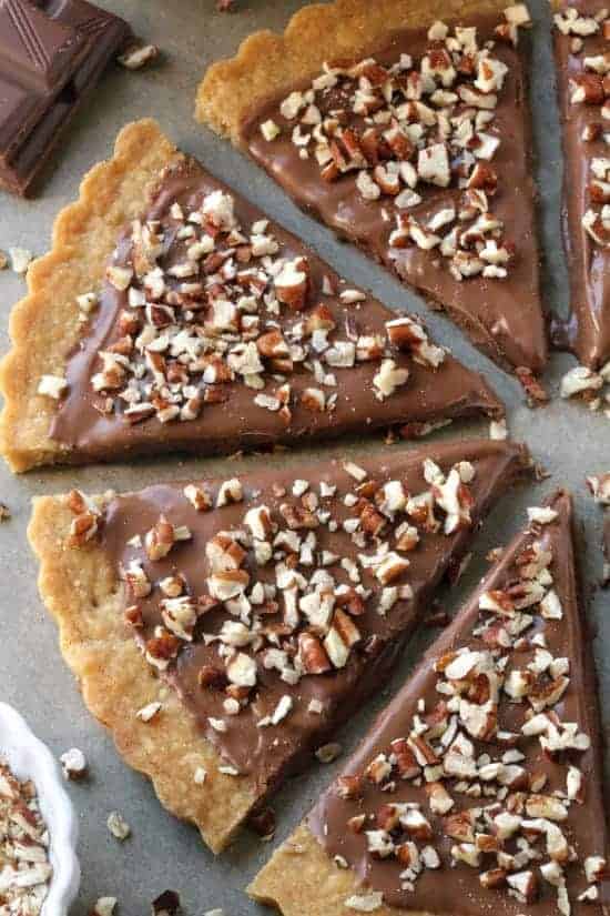 Something else I experienced is that rolling out cookie dough is far too fussy when you can just pat the dough into a tart pan, cut them into 8 pieces and call it a day. So much simpler and I think they look pretty neat that way when dipped (or more like slathered) in chocolate and sprinkled with nuts.