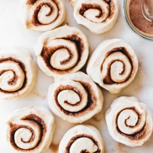 These finished Frosted Cinnamon Rolls are topped with a sweet vanilla frosting. I like to frost these cinnamon rolls when they’re still a little bit warm, so the frosting melts down into the swirls of the cinnamon rolls.