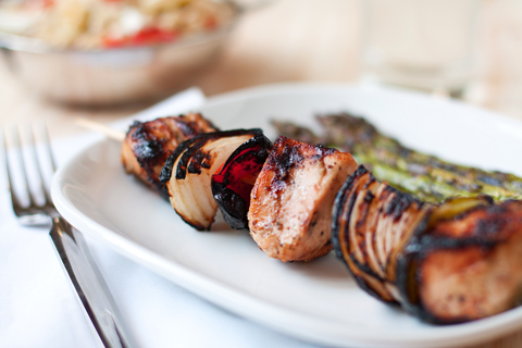 - Lightly oil the grill grate. Grill skewers for 10 minutes, turning as needed, or until meat is cooked through and vegetables are tender.