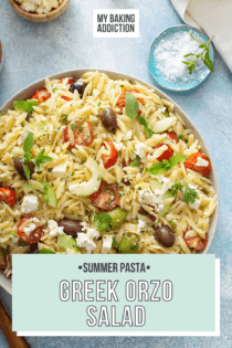 Greek Orzo Salad is fresh and bright, perfect for summer! Made with feta cheese, tomatoes, cucumber, olive, and plenty of herbs and lemon, this pasta salad is delicious on its own or alongside grilled chicken.