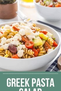 Definitely make this Greek Pasta Salad the night or day before you are going to serve it because it just gets better when the flavors have time to develop.