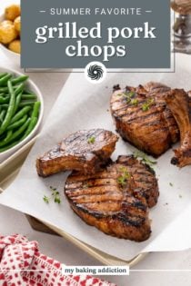 These chops are marinated in a recipe similar to my grilled chicken marinade, then grilled until they are charred and flavorful on the outside but still juicy on the inside.