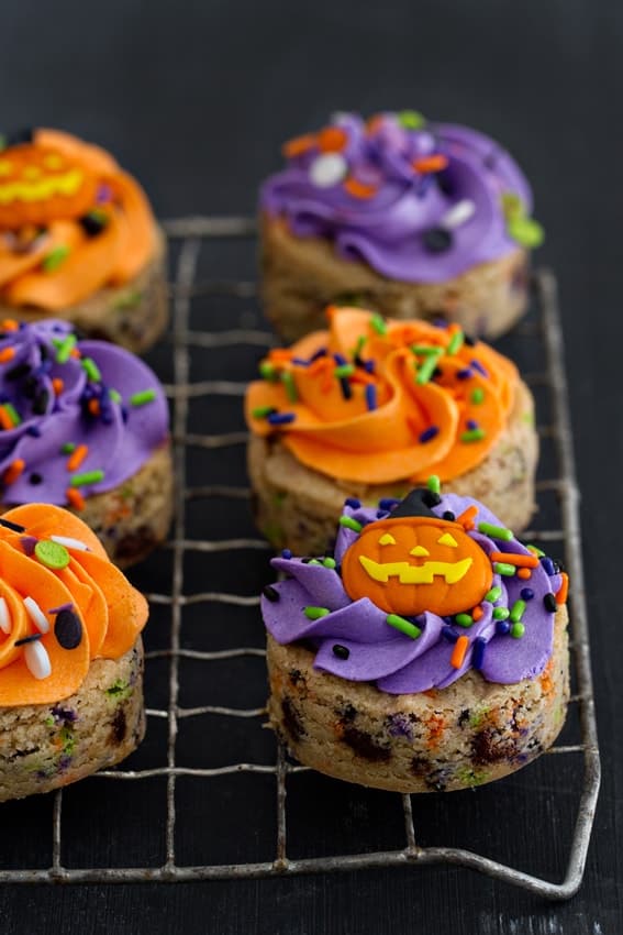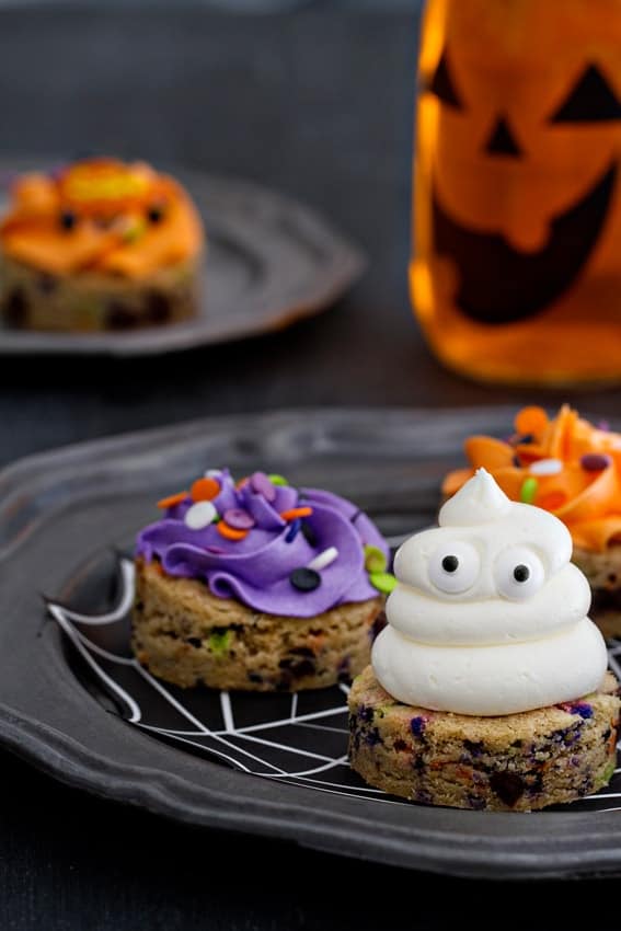 While these Purely Simple Chocolate Chip Cookies were perfectly delicious on their own, I decided to jazz them up a bit by adding in colorful Halloween sprinkles and pretty swirls of buttercream. However, if using food dye is not your thing, simple spirals of plain buttercream create adorable ghosts that are pretty darn boo-riffic!