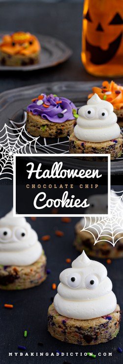 Halloween Chocolate Chip Cookies are made fun and festive with candy eyes and bright swirls of buttercream frosting. Boo could resist?!