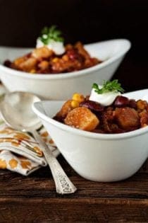 I also like to load my chili with vegetables such as bell peppers, onion, jalapeno, corn and potatoes. Yes, you read that right, I always toss a large Idaho potato into my chili. I canโt recall what prompted me to place a potato in my chili, but I have been doing it for years and chili just isnโt the same without out it this random addition. Thatโs one of the great things about chili; you can totally personalize it by adding your own special twist.