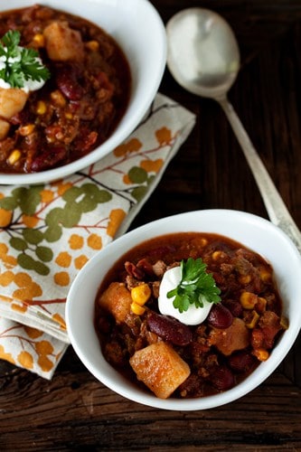 Potato might seem odd but I know how much I love a baked potato topped with chili so why not? Iโm making chili I took to a Super Bowl โthrowdownโ last year for the game tomorrow. Yes, it won but Iโm not sure it was the chili as much as the topping, a lime crema. Just add a bit of fresh lime juice and some lime zest to your sour cream toppingโฆso good! Perfect with the heat youโve got in this fabulous recipe!
