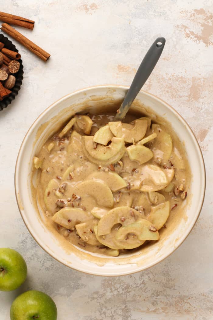 Turn the mixer to low speed and add the oil, sour cream, and vanilla, mixing until just combined. Slowly add the dry ingredients and mix until just incorporated, then fold in the apples and the nuts, if using.