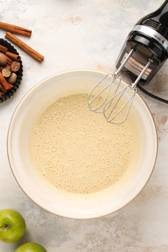 - In the bowl of a stand mixer fitted with the whisk attachment, or in a large bowl with an electric hand mixer, beat the eggs and sugars on high speed for 5 minutes. The mixture will increase quite a bit in volume. Turn the mixer down to low speed and add in the oil, sour cream, and vanilla and mix until incorporated. Gradually add in the dry ingredients and mix until just combined. Fold in the apples and optional nuts.