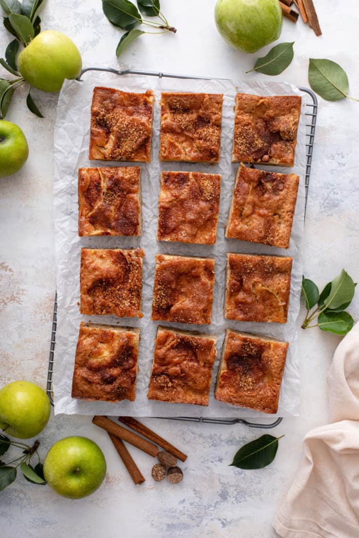 My go-to apples for this homemade apple cake are granny smith. They’re tart and crisp and go well with the sweetness of the cake.