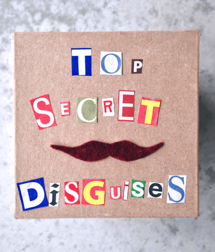 I made storage boxes for both sets out of paper mache boxes I got at the craft store and decorated, but you could use old hat boxes, shoe boxes, or even an old briefcase. If you’d like to add a little more to the disguise kits, the dollar store is great for glasses, badges, crowns, etc. This could become the coolest gift ever!