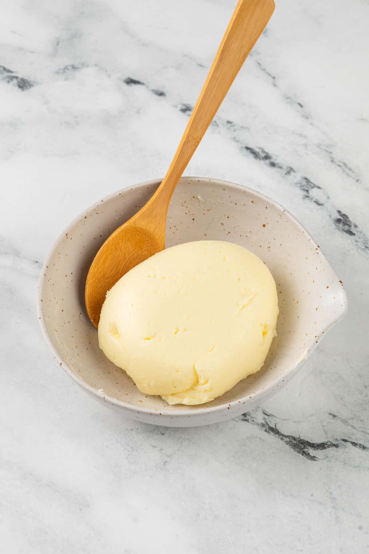 - Place the butter in a clean bowl and cover with cold water. Use a spatula or your hands to knead the butter, pressing out any remaining buttermilk. Repeat this process until the water is clear.