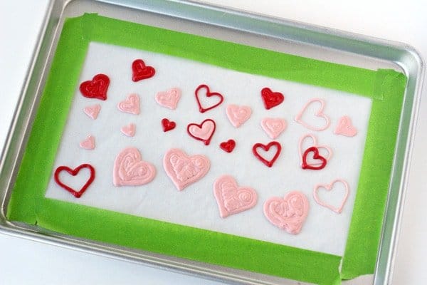 “Draw” your desired shapes (in this case hearts) with the melted candy melts, onto a sheet of parchment paper. To keep the parchment paper in place, use painters tape to tape the paper to a baking sheet (as shown below).