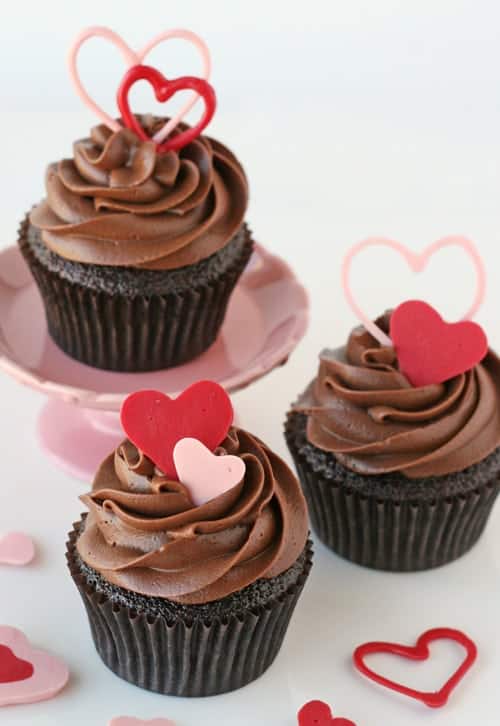 Hi MBA readers! I’m Glory of Glorious Treats, and I’m so happy to be here! I love beautiful and delicious desserts, so needless to say, I love My Baking Addiction! Speaking of love… how about some Valentine’s Day inspired cupcakes?I started with delicious Chocolate Cupcakes, topped with rich Chocolate Cream Cheese Frosting, and dressed them up with easy heart accents.
