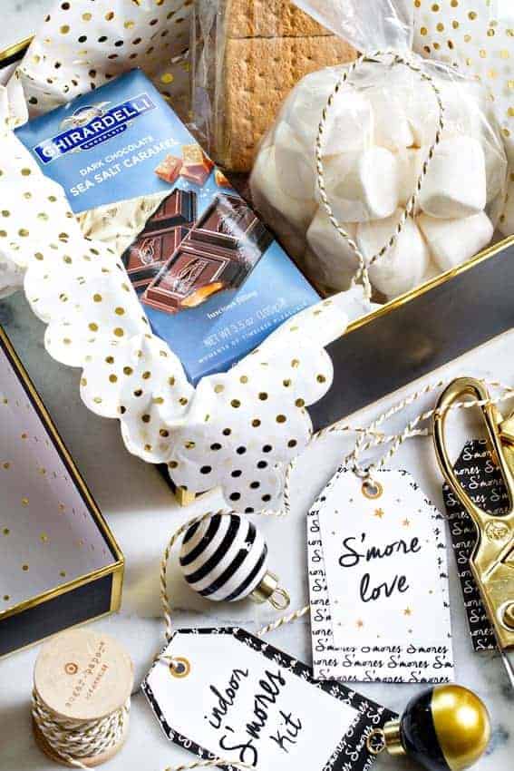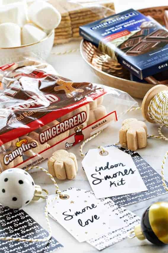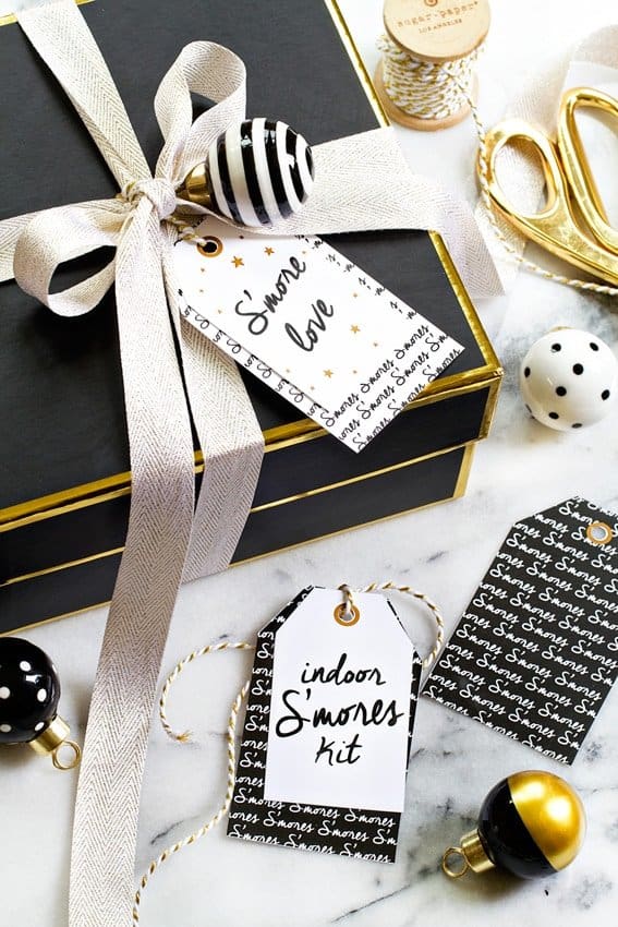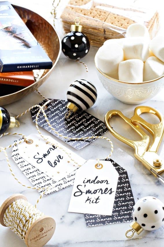 An Indoor S’mores Kit is the perfect last minute gift for coworkers, neighbors and friends. With an adorable printable tag, your gift will really stand out under the tree!