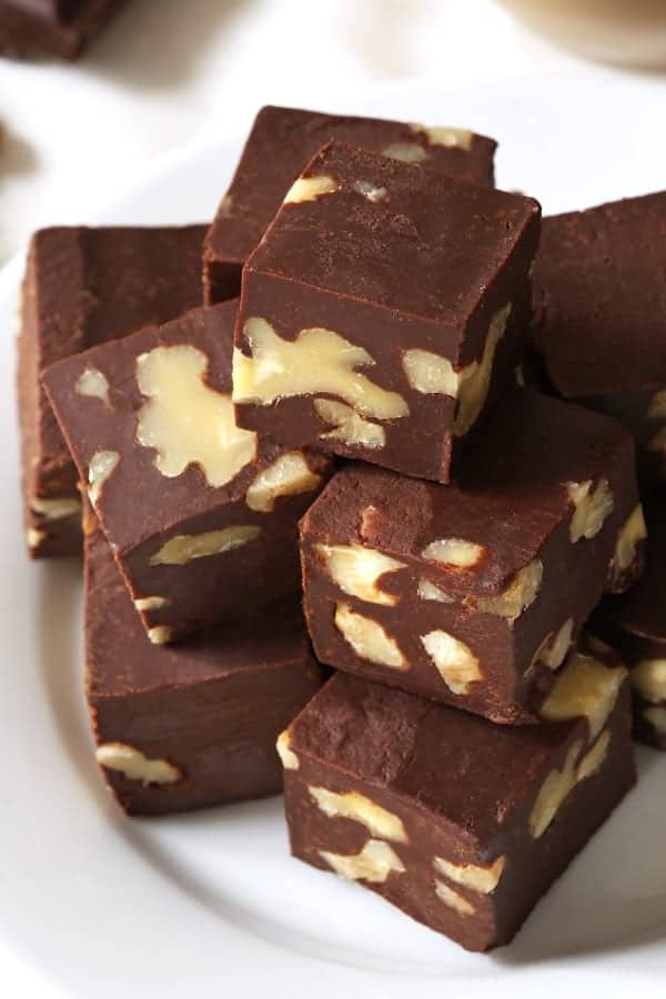 This fudge really doesn’t need any add-ins but I tossed in some walnuts for a bit of a crunch. I didn’t want a strong nutty flavor so I didn’t toast the walnuts.