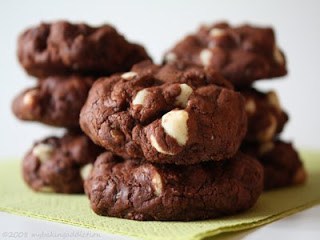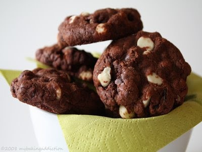 Scrape down the bowl and mix in the semisweet and white or milk chocolate chunks (or chips), nuts, and raisins. Drop dough by heaping tablespoons leaving about an inch of space between mounds of dough. Bake one sheet at a time for 10-12 minutes. The tops of the cookies will look a little dry, but the interiors should still be soft.