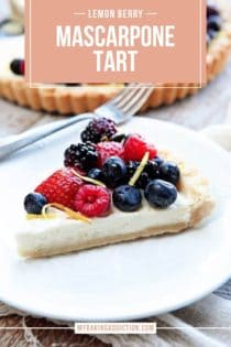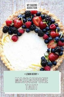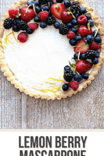 A Lemon Berry Mascarpone Tart is a simple, delicious way to show off all the season’s best berries. A creamy mascarpone filling, a hint of fresh lemon, and four kinds of berries, all on top of a sweet shortbread crust!