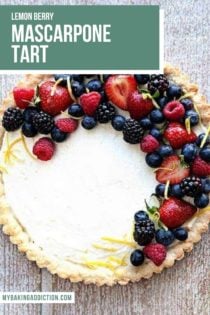 - To prepare the filling, combine the mascarpone, sugar, lemon juice, and vanilla in a small bowl and mix until smooth. Spread mixture evenly in cooled tart shell, then top with berries. Garnish with lemon zest.