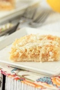I had all the ingredients in the pantry, so I headed into the kitchen and got to baking! This recipe is so easy, I utilized my food processor which made the crust come together in a matter of minutes. The end result was a lovely citrus flavored bar dessert with an amazing toasted coconut topping…seriously, these bars scream warm weather!