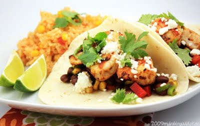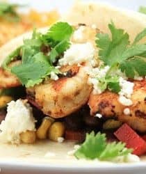 2. Place the corn and black bean salad on the bottom of the soft taco shell, top with shrimp and garnish with feta cheese and cilantro.