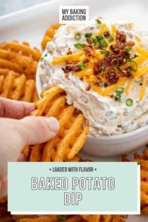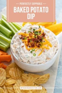 I serve baked potato dip with chips, veggies like carrots sticks, or fries. Or, try it on top of your next baked potato! You can’t go wrong with this delicious dip.