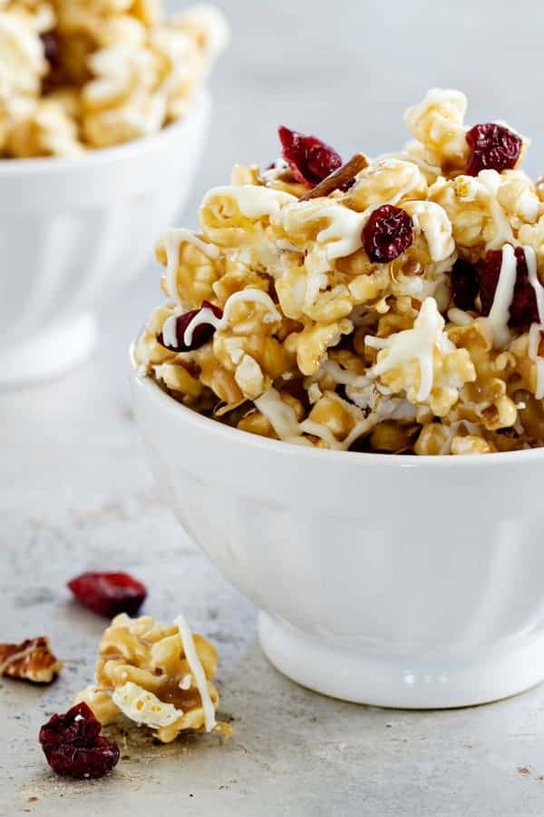 In truth, all the flavors in this caramel corn make it the perfect fall treat. Warm maple and tangy cranberries are balanced out with earthy pecans and creamy, sweet white chocolate. I mean, there’s not much more you could ask for, right?