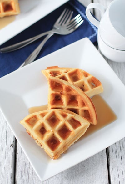 Making homemade waffles is simple and only requires a handful of ingredients. Once you find your go-to waffle recipe, you can experiment with a variety of ingredients. Anything from chocolate chips to bananas can be tossed into the batter to make plain waffles go from ordinary to extraordinary. Last Sunday, I whipped together these Maple Chip Waffles for a hungry crowd. I cooked them up until they were crisp and slathered them with butter and pure maple syrup. They were the perfect Sunday morning breakfast served alongside some crispy bacon and piping hot coffee. If you are staring at the photos in search of maple chips, you are not going nuts, they all just kinda sink to the bottom of the waffle and are not all that visible in the photos! They are there, I promise!