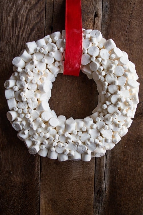 We’re well aware that marshmallow wreaths may be a little out of the ordinary, but they’re super fun to make and if I’m being honest, I kinda adore the all white wreath with a bright pop of red ribbon. It’s such a festive color combination that looks pretty amazing against a dark surface.