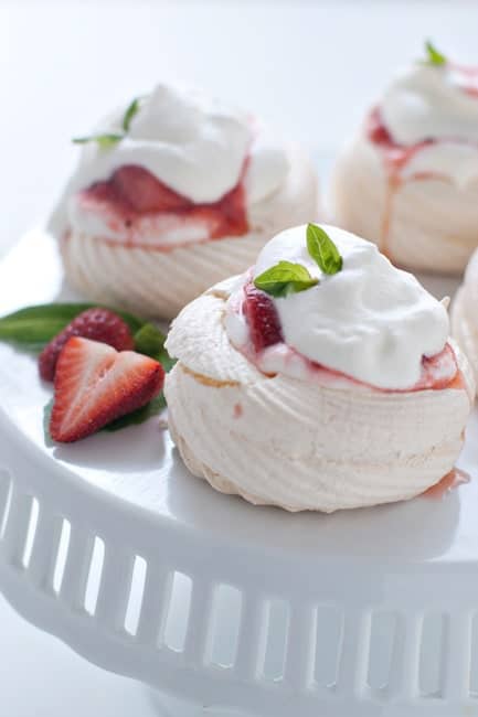 While I’ve made meringue cookies on several occasions, I’ve never made a large, layered pavlova, but it is definitely a baking goal of mine. In order to warm up and stretch my meringue muscles, I thought I would start by baking some Meringue Nests with Basil Scented Strawberry-Rhubarb Compote. These individual meringues are light and crispy shells topped with syrupy fruit and finished off with a dollop of sweet whipped cream. Whipped cream seems to make everything better, right?