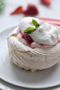 These airy meringue nests make a perfect dessert for any Spring meal. Not too heavy, but extremely satisfying in the sweet tooth department. Plus, the strawberries and rhubarb are a classic combination that is only enhanced by the surprisingly delightful presence of the basil. Although, I would pretty much eat anything if it was served in a sweet little meringue shell. Just saying.