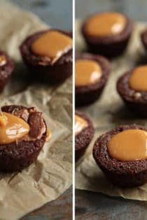 Bite size brownies are stuffed with miniature Milky Way candy bars and topped with pool of caramel to create a popable bite of brownie bliss. Moral of the story? Brownies break funks.[pinit]