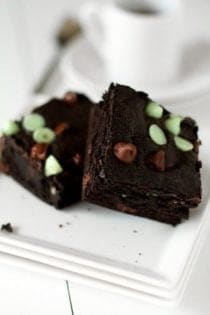 I made two varieties of Katieโs brownies, my thought was Iโd easily be able to send Brian with two different desserts without all the extra work. The first were mint brownies brimming with Nestleโs Dark Chocolate Mint Chips. These chips are a seasonal item and since Iโm a sucker for anything seasonal, there is a stockpile of these in my pantry. For the second variation, I whipped up Dark Chocolate Brownies with Orange Cream Cheese Frosting. Both adaptations were moist, decadent and scrumptiousโฆbut I swear something about these mint brownies soothed my cold and put me in a better mood.