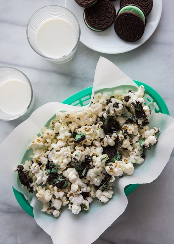 When I think of St. Patrick’s Day, I usually focus on savory dishes like Beef Stew and Irish Beef and Vegetable Hand Pies. Pretty much anything that I can squeeze a bottle of Guinness into is totally my jam. The thing is, my kids like to have some treats around and having simple desserts that can be infused with a bit of holiday flair are what I love. This Mint Cookies and Cream popcorn can be made for any holiday, just switch out the Oreos. Want Spring Cookies and Cream Popcorn? Pick up a bag of the cute yellow filled Oreos and sprinkle with adorable pastel sprinkles. Plus, the recipe is all something that the kids can help make.