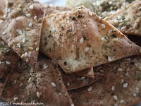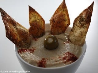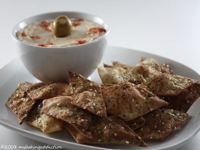 I definitely wanted to stay with the Middle Eastern flavors of the Za’atar, so I made hummus. The recipe I used can be found by clicking here. I used soaked garbanzo beans instead of canned, but followed the rest of the directions as written. The combination of flavors made this snack absolutely amazing, the boyfriend talked about these all night while watching football. He actually asked me to make more at 8:30 in the evening, after he inhaled the other batch…seems he prefers these to our much loved Stacy’s Pita Chips. I will definitely be making these again and again, just not at 8:30 at night. I will be interested to hear from other Daring Bakers how long these stay crispy in an airtight container, because I really think I would double the batch next time. I really am very thrilled to join the Daring Bakers, I think that being a part of this group will force me to think out my comfort zone.