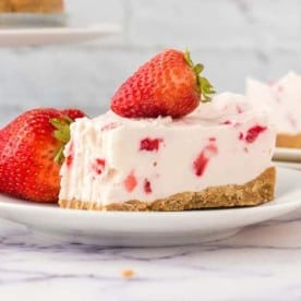 This no bake strawberry cheesecake is light and fluffy and the cream cheese filling is bursting with fresh strawberries. This cheesecake only requires a few ingredients and is ready to eat in about 4 hours!