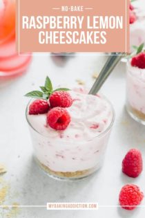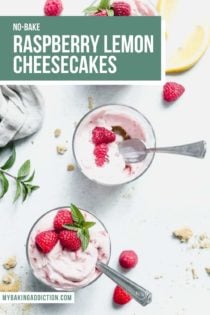 Before serving, I like to garnish my cheesecakes with fresh raspberries and a sprig of mint, but you could also top them with more whipped topping or lemon zest.