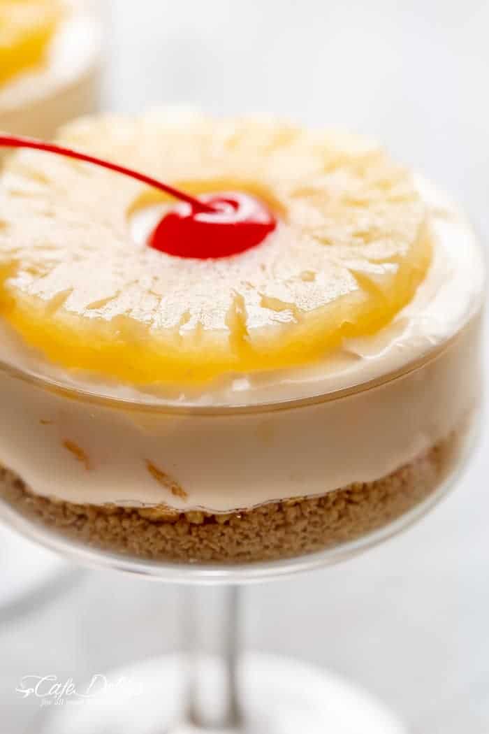Everything you love about cheesecake in an individual serving glass, with each spoonful delivering a buttery graham cracker base, a creamy ‘cheesecake’ centre filled with juicy pineapple pieces, and a pineapple ring with a maraschino cherry to complete the Upside Down Pineapple craving.