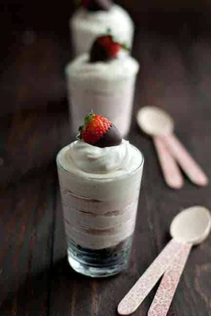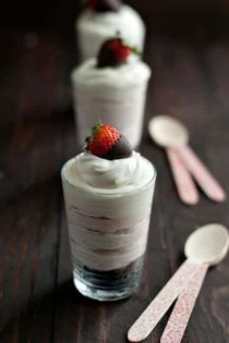 The addition of a small chocolate covered strawberry makes this dessert a perfect Valentineโs Day treat. Try serving these in wine glasses or other elegant glasses for the perfect end to a romantic dinner. And since Iโve used Truvia Baking Blend instead of sugar, you may have just a little less guilt about indulging.