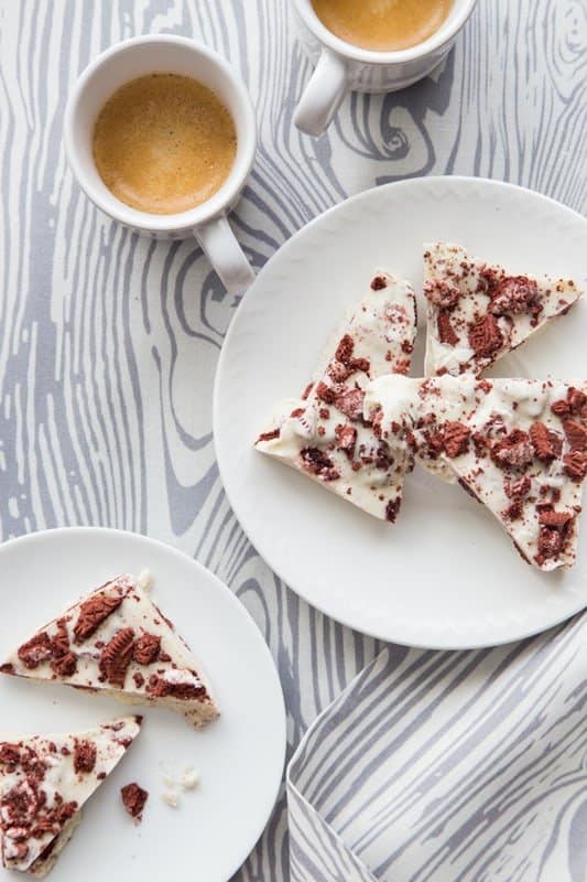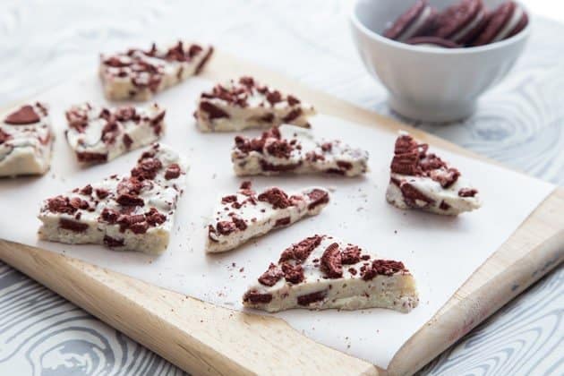 If I’m totally honest with you, the inspiration for this bark came simply from needing to use up a few bags of white chocolate chips and the rest of a pack of Red Velvet Oreos I bought (or over-bought, as the case may be). If you can’t get your hands on Red Velvet Oreos, really any Oreo will flavor will do. I’m kinda daydreaming about a milk chocolate and peanut butter Oreo combo – just sayin’.