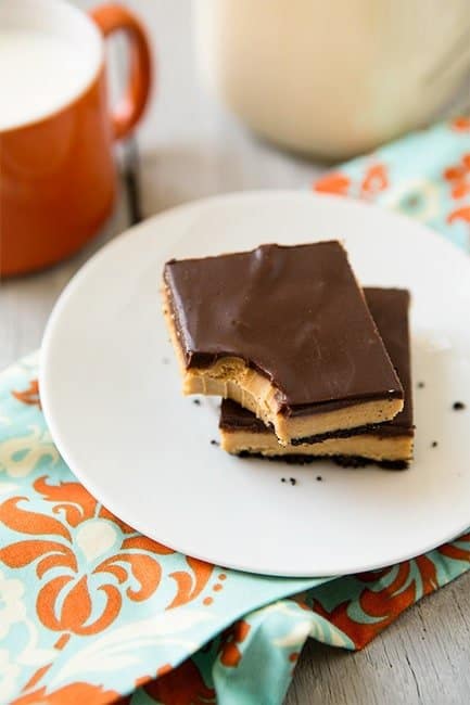 Seeing as how we’re well past the New Year at this point, I’m not sure what to do about the lack of peanut butter bliss for I certainly did not have my fill of sugared goodness this season. The answer? Turn them into something else. Yes. Not only did I deconstruct my favorite peanut butter ball recipe into bar form, but I added a crust and delighted in the not rolling of the balls, the lack of dipping them into chocolate, and the 2″ squares that qualify as a “serving.”