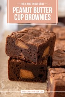 Peanut butter cups – To make this peanut butter brownie recipe, you’ll obviously need peanut butter cups! I use the standard size cup because I like the peanut butter-to-chocolate ratio, but you can use mini cups if you like (just more of them!).