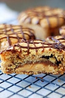 Inspiration came the next day from two things. I opened my cupboard and was reminded of my mini-square cake and muffin pan, which I had yet to use, and I visited my dear friend Annie’s food blog, With Sprinkles On Top. Annie had just posted a recipe for thin and crispy oatmeal cookies. Now you’re talking! What’s better than a Peanut Butter Snickers? A Peanut Butter Snickers enveloped in crispy oatmeal cookie dough, that’s what.