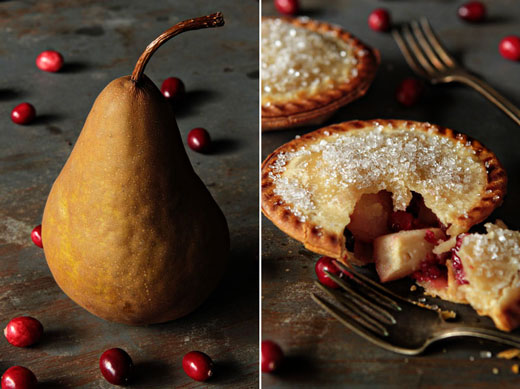 Roasted Bosc pears blend perfectly with the sweetness of vanilla sugar and the tartness of fresh cranberries to create a dessert that will be just different enough to stand out from the standard apple pies, but familiar enough to please all the traditionalists at your table. Adding in a little ginger, cinnamon and cardamom gave these adorable pies a seasonal flair that would be perfect finish to any holiday party.