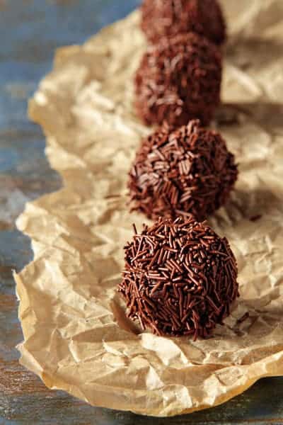 4. Line a baking sheet with parchment paper. Using a small scoop (2 teaspoons) or a melon baller, scoop out chocolate mixture, roll into one inch balls, and place on prepared baking sheet. Continue with remaining chocolate mixture. Roll balls in your desired coating, I typically use high quality sweetened cocoa powder such as Scharffen Berger or chocolate jimmies as seen above. Refrigerate truffles until ready to serve.