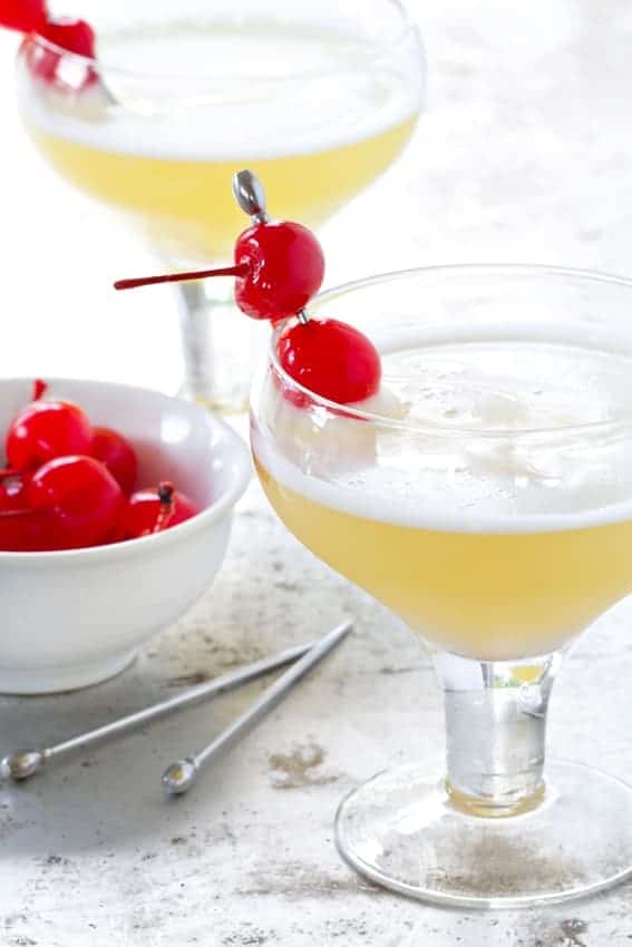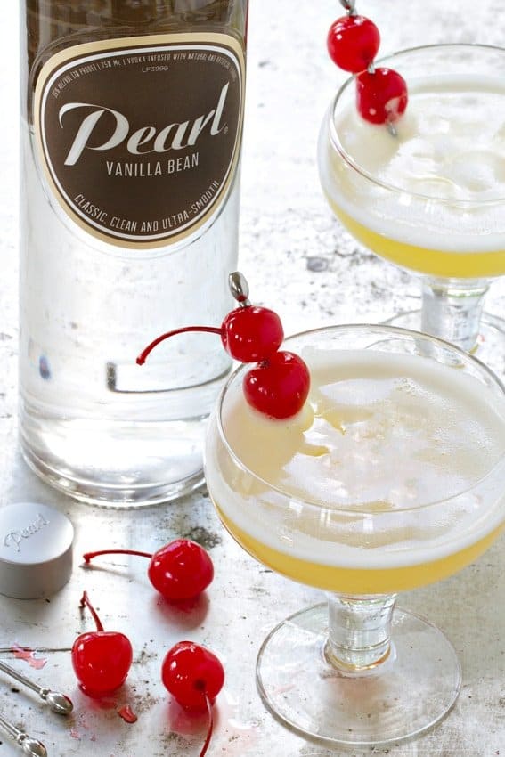 Sweet pineapple juice and Pearl Vanilla Bean vodka are combined with just a little bit of Maraschino cherry liqueur and a super frothy pasteurized egg white. While you can skip the egg white if you want to and still have a great drink, I really like the extra richness it provides – making this cocktail feel truly dessert-like. Using a pasteurized egg white makes it pretty safe to do so.