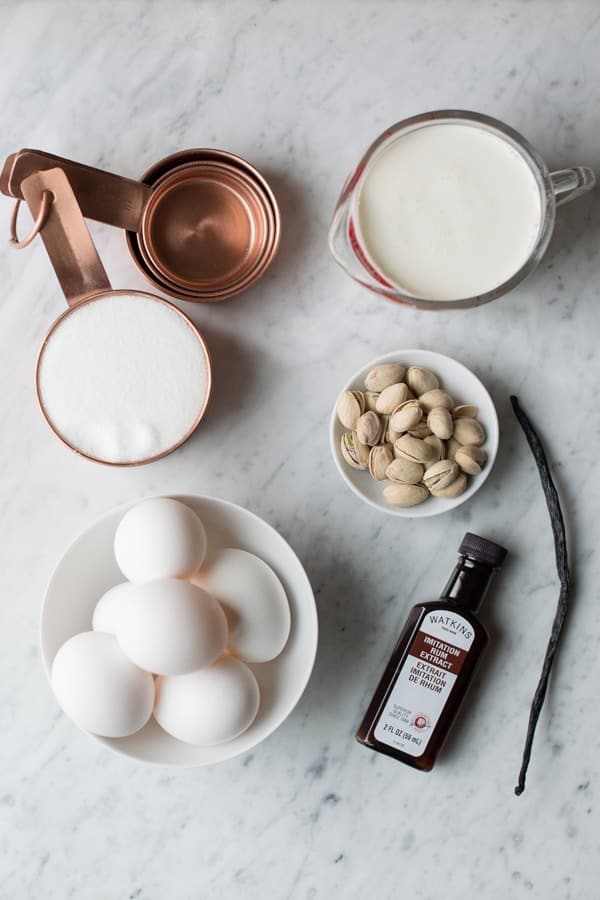 We kind of have a thing for pistachios. They add an instant punch to salads and snacks, and we always have them in our pantry. They were calling our name for this recipe; our Pistachio Rum Crème Brûlée was taking shape. I originally wanted to add pistachio extract, but it proved to be hard to find.