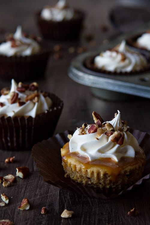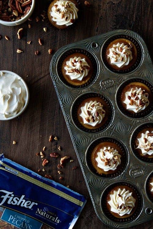 Then I just got ridiculous and covered each mini pumpkin cheesecake in salted caramel sauce, whipped cream and more Fisherโs Pecans. Because thatโs how I roll.