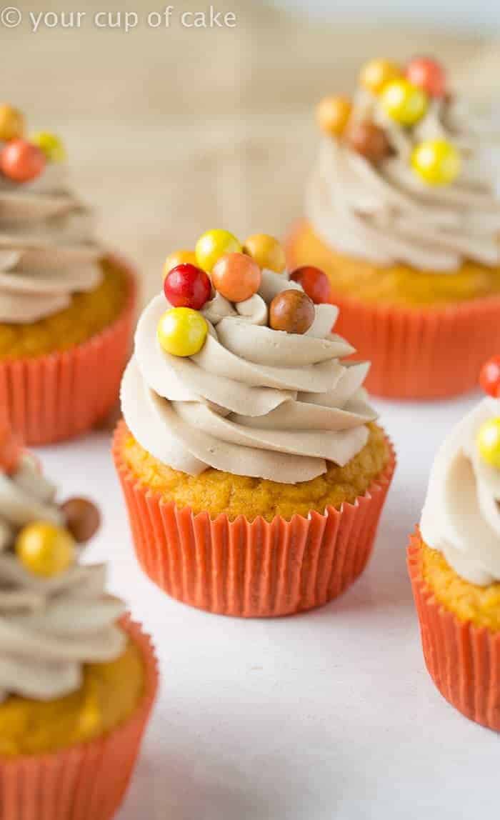 I love creating recipes for every type of baker, especially the ones who think they can’t bake! So you’ll find a scratch cake recipe and also a cake mix recipe for these Pumpkin Maple Cupcakes. I love including cake mix recipes because you can swap in a gluten free cake mix if you need to and the cake still turns out perfectly!