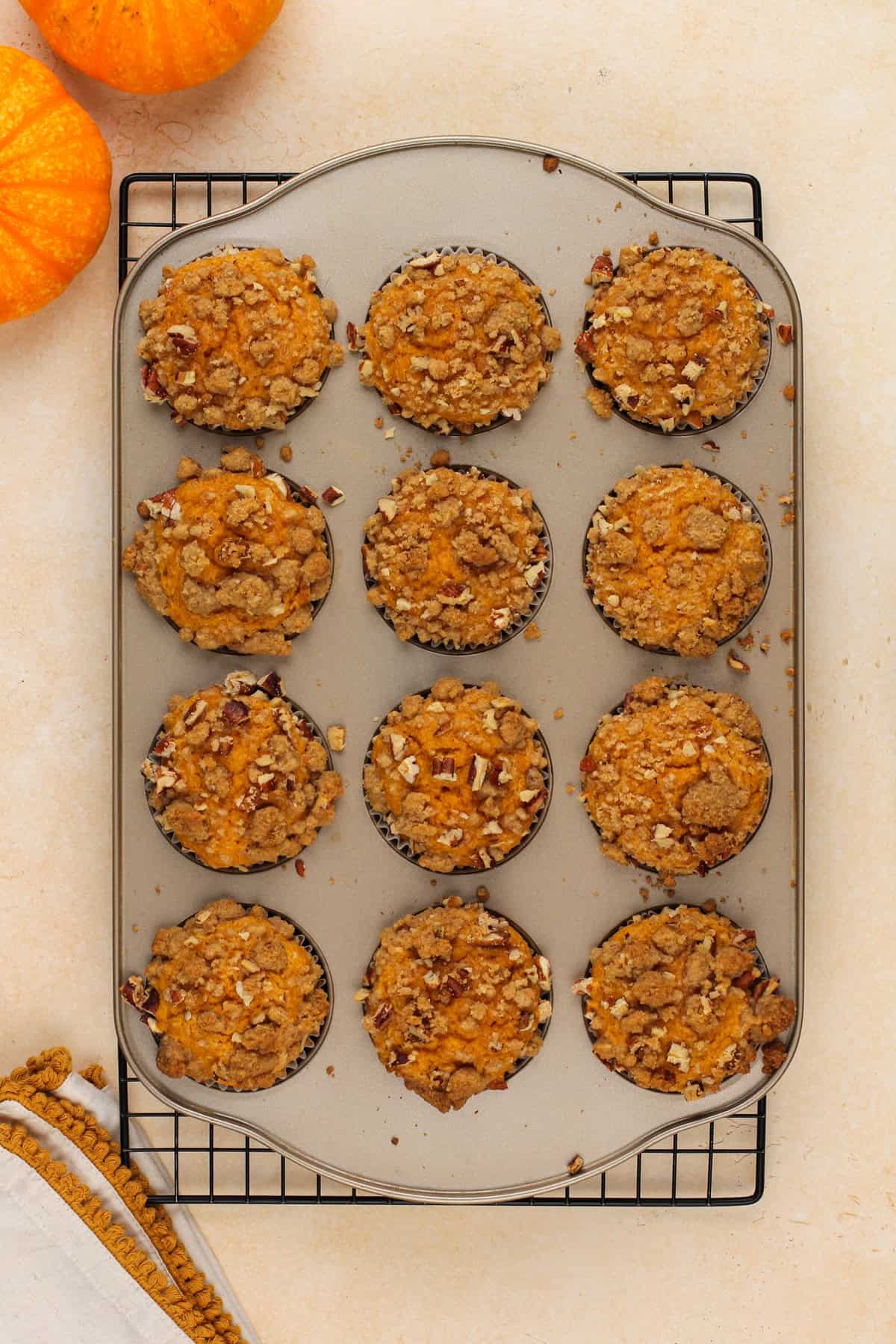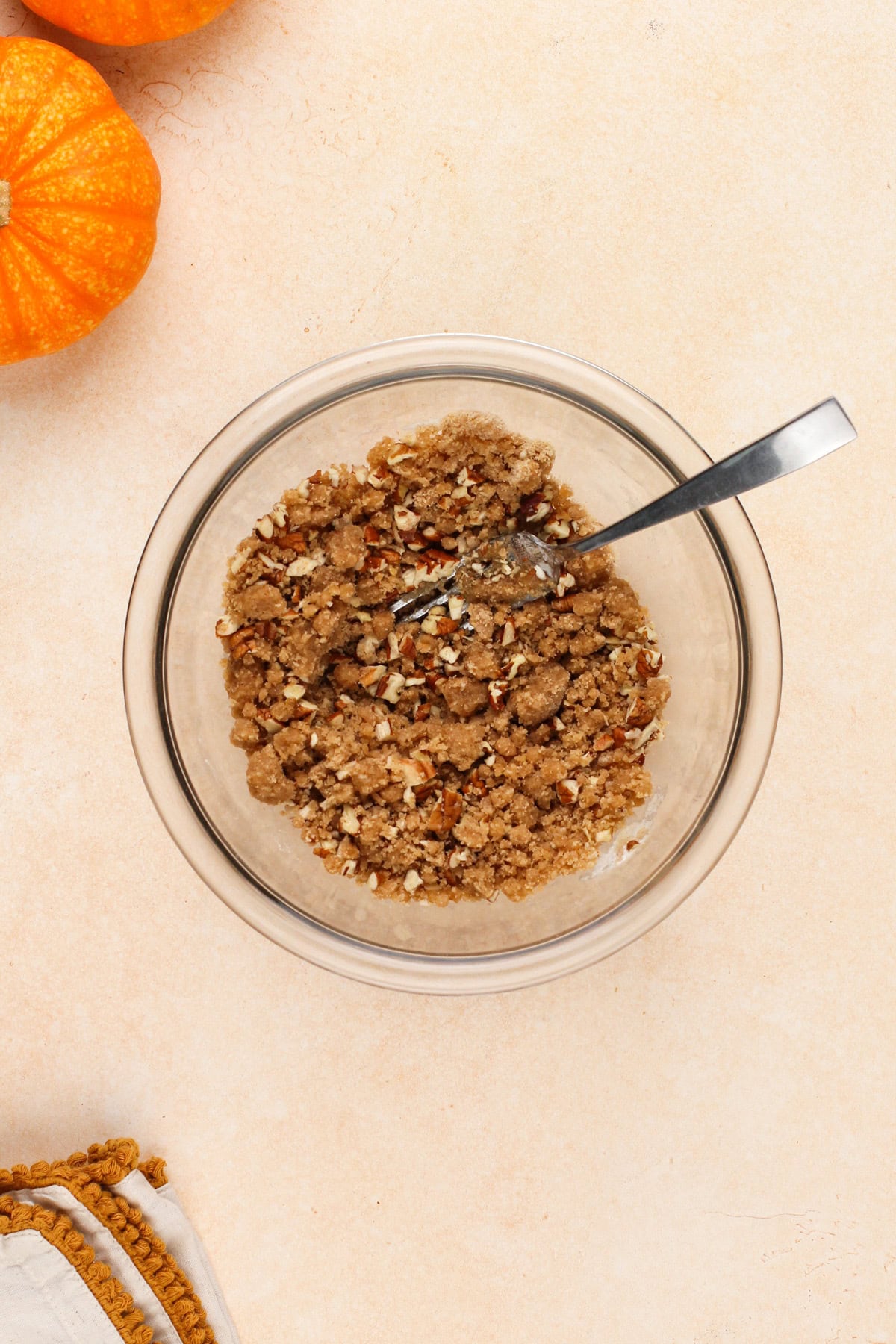 - Prepare the Streusel Topping: In a medium bowl, mix brown sugar, flour, pumpkin pie spice and salt. Add butter and mix with a fork until crumbly. Stir in optional pecans if desired. Refrigerate until ready to use.