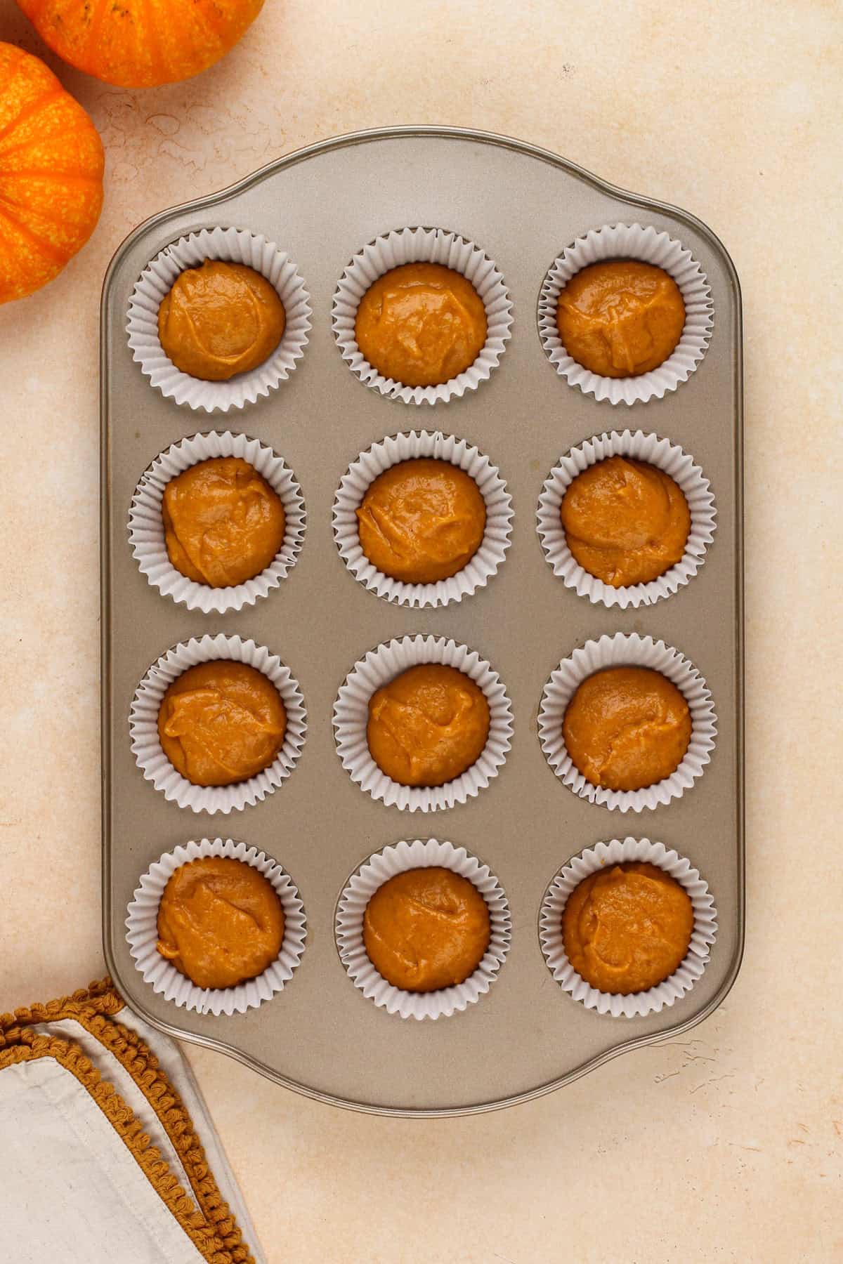 Now it’s time to assemble the muffins. Add about 1 1/2 tablespoons of the muffin matter to each of the prepared muffin wells. I like to use my medium cookie scoop to make this super easy.